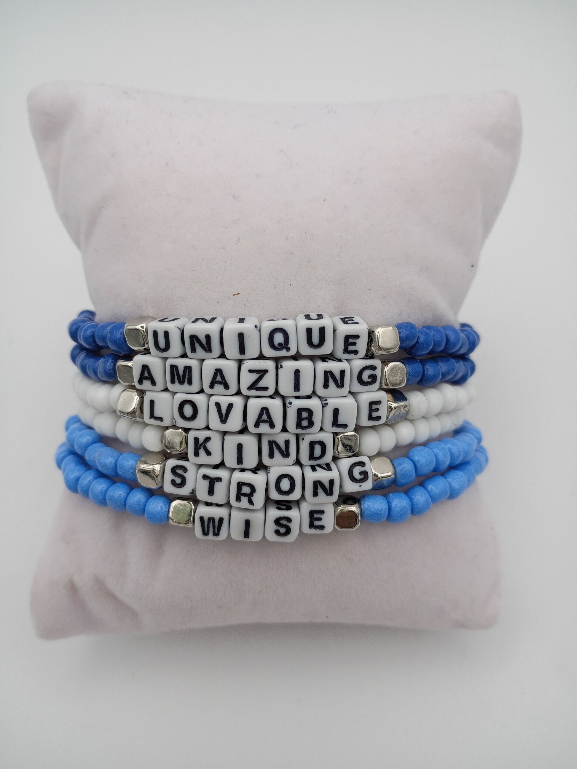 Six stackable 7.5 inspirational bracelets makes a great gift. These bracelets are stretchy modern and trendy. Made with small seed beads which makes them comfortable to wear all day.